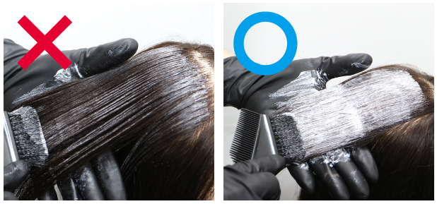 しっかりブリーチし、ムラをなくすために、髪が薬剤に包み込まれるイメージで、ひたひたになるくらいたっぷり塗布します。