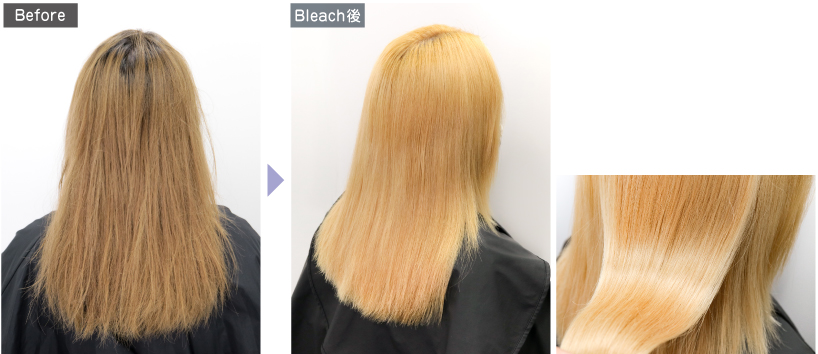 明るくブリーチしたい場合も、事前ダメージの状態によっては、求める明るさまでブリーチをしない、またはブリーチそのものをしないという選択もあります。
