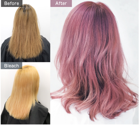 リタッチ後、全体の明度を上げるためにブリーチ剤を再塗布して18Lvまでベースを整えます。オンカラーでは濃く発色するピンクにクリア剤を混ぜることでペールトーンのピンクに仕上げます。