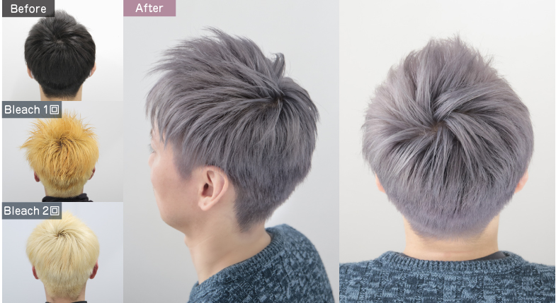 バージン毛から2回しっかりブリーチします。ベースを白っぽくした方がキレイなシルバーになりますが、ブリーチだけでは完全に黄味が抜けた白になることはありませんので、できるだけ明るく薄い黄色にした後に、薄い紫色を補色として使い、黄味を打ち消します。