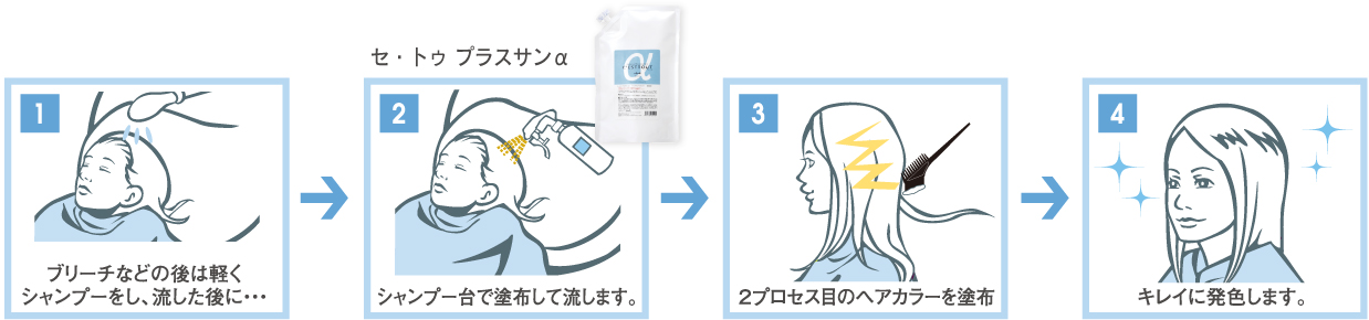 2. 軽くタオルドライし、セ・トゥ プラスサンαの原液を塗布し、コーミングして水洗します