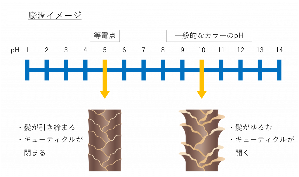 まず1剤に含まれるアルカリですが、これが残留することで「等電点に戻らない」「イオン結合が戻らない」「髪が引き締まらない」「キューティクルが閉まらない」などが起き、ダメージしやすい状態でお客さまをお帰しすることになります。