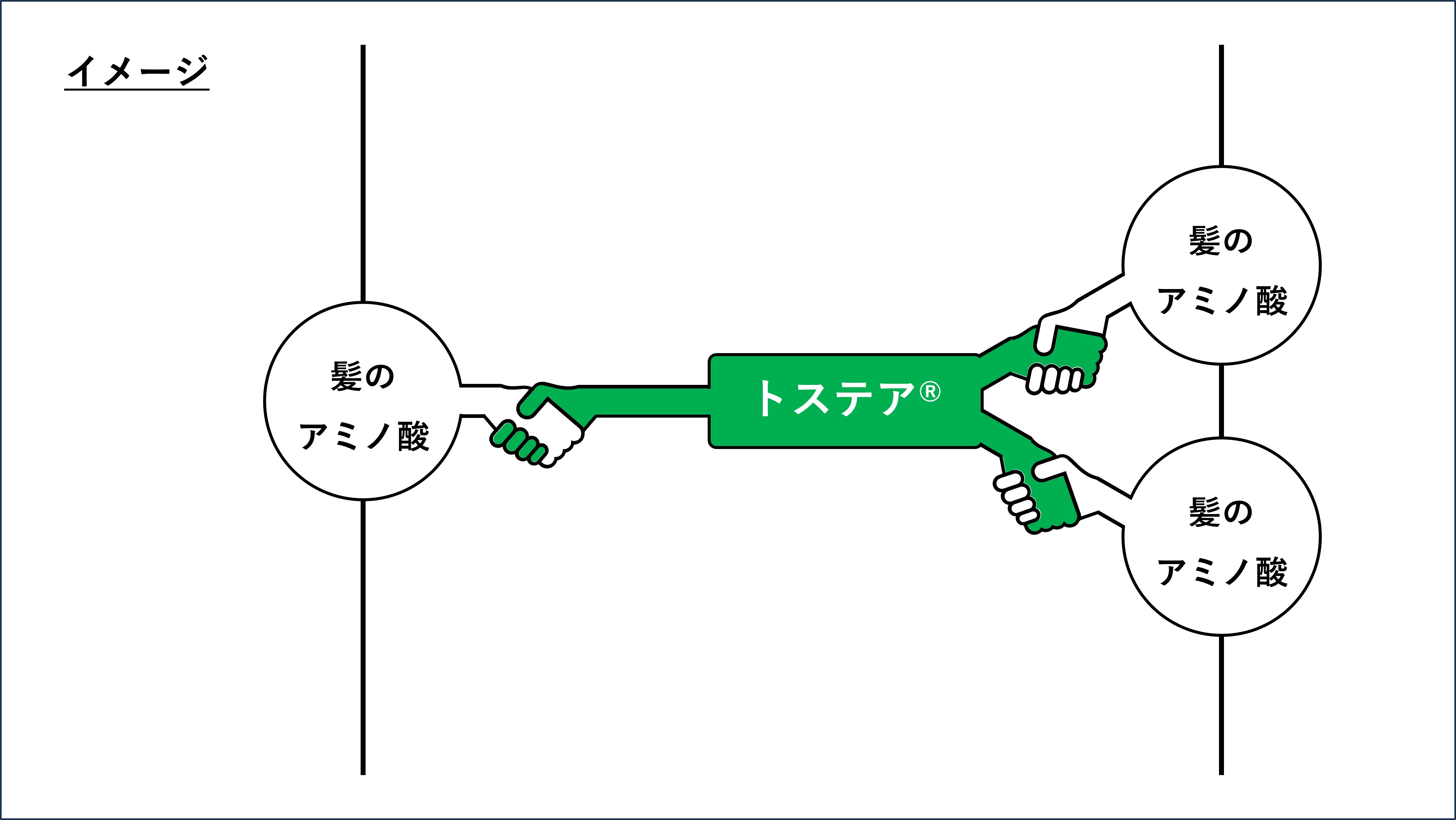 ご存知のように毛髪のケラチンタンパク質は、20種類ほどのアミノ酸の集合体ですが、トステア®はこのアミノ酸とアミノ酸の間に入り架橋します(橋をかけます)