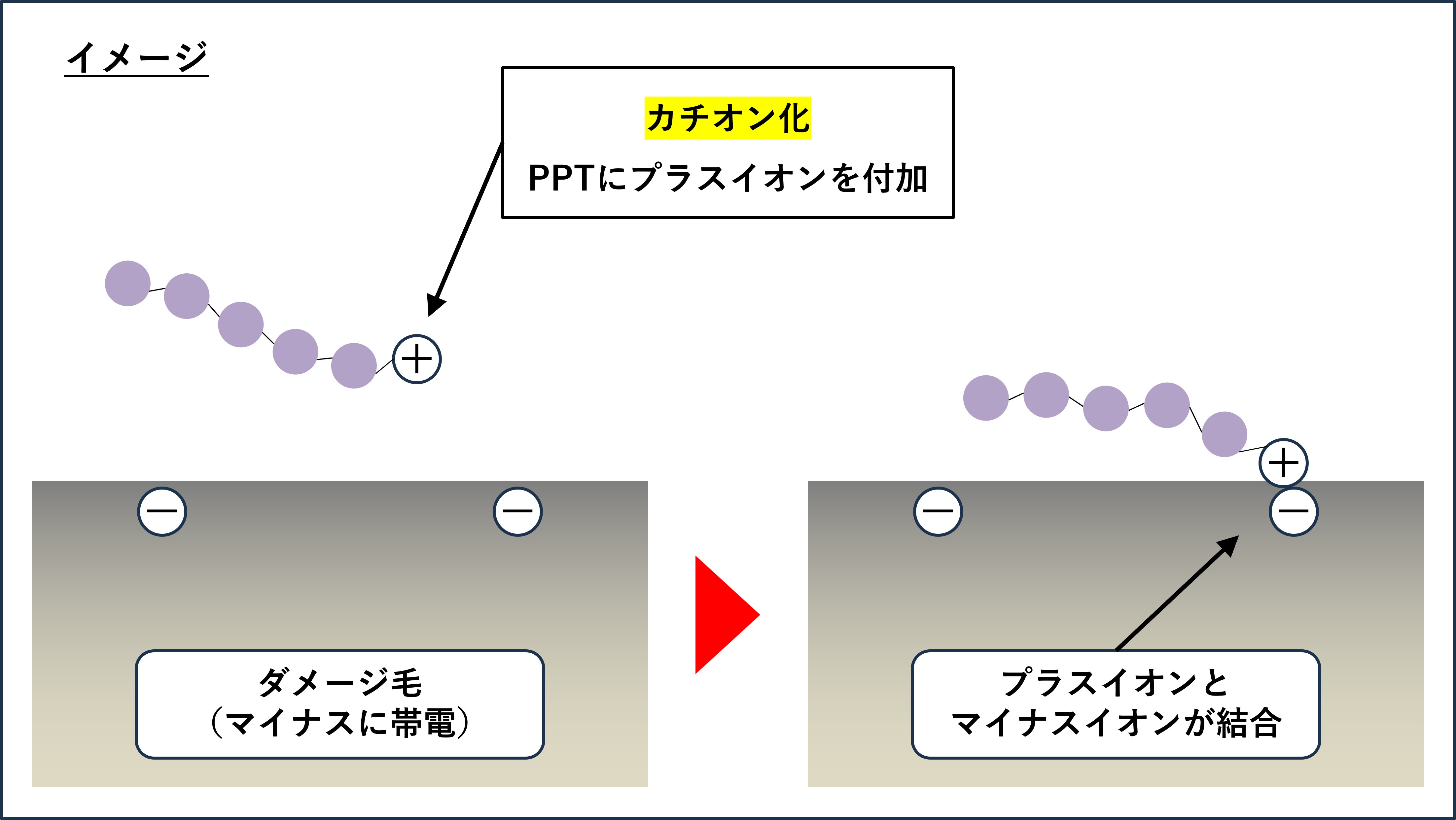 PPTにプラスイオン成分を追加し、ダメージ毛(マイナスに帯電)への吸着性を高めます。