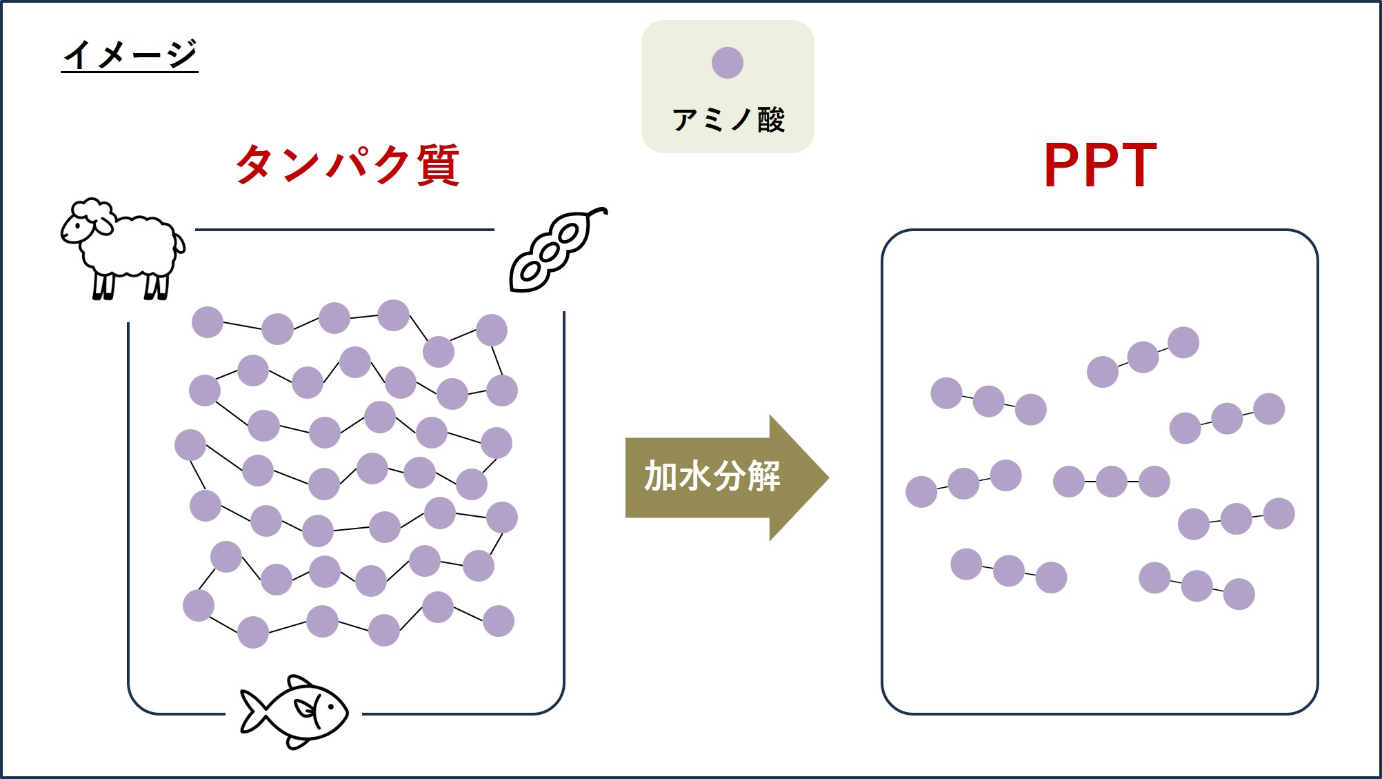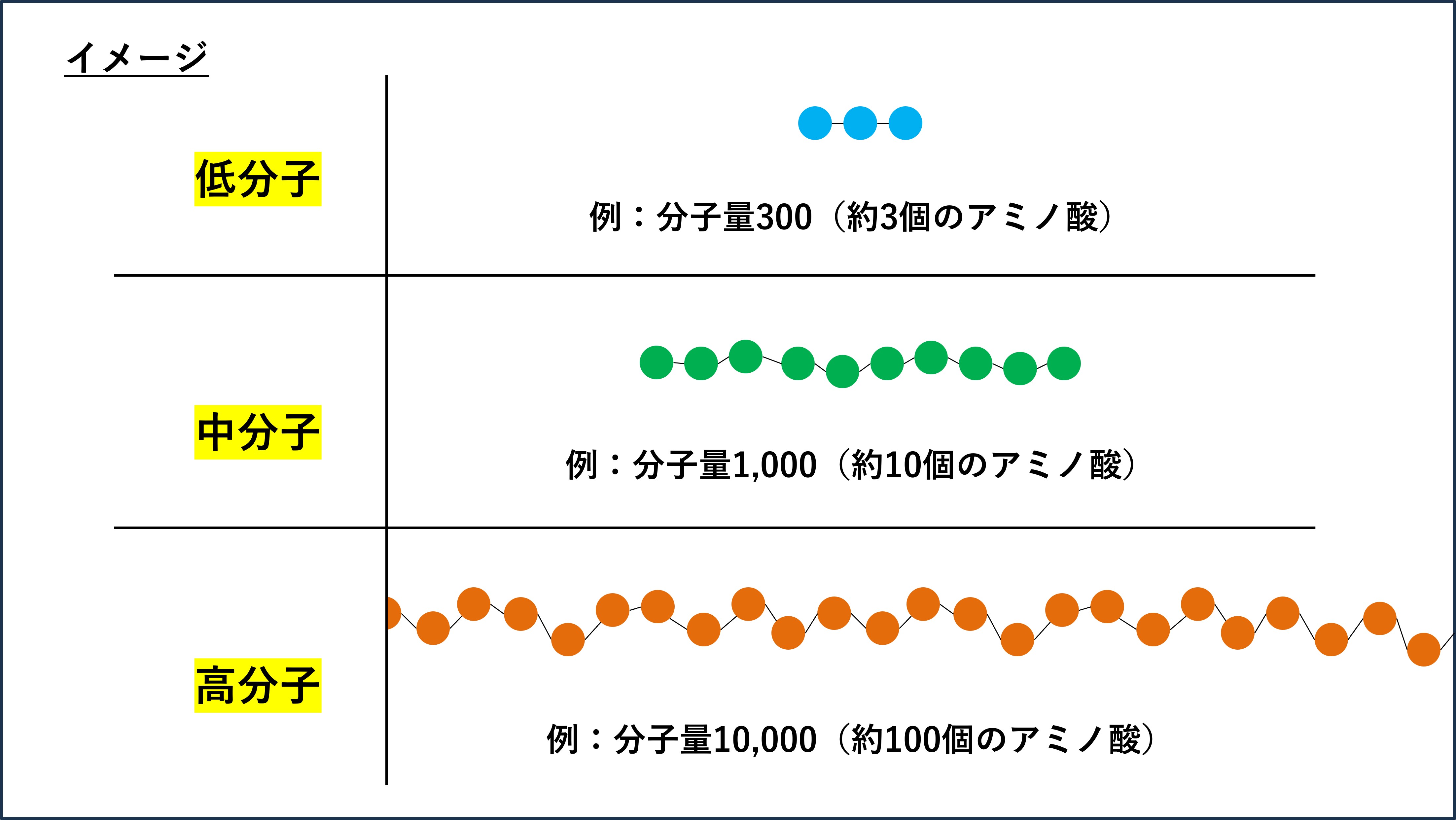 一般的に、1つのアミノ酸の分子量は約100とされ、合計が数百単位のものが低分子PPT、数千単位のものが中分子PPT、数万単位のものが高分子PPTに分類されるかと思います。