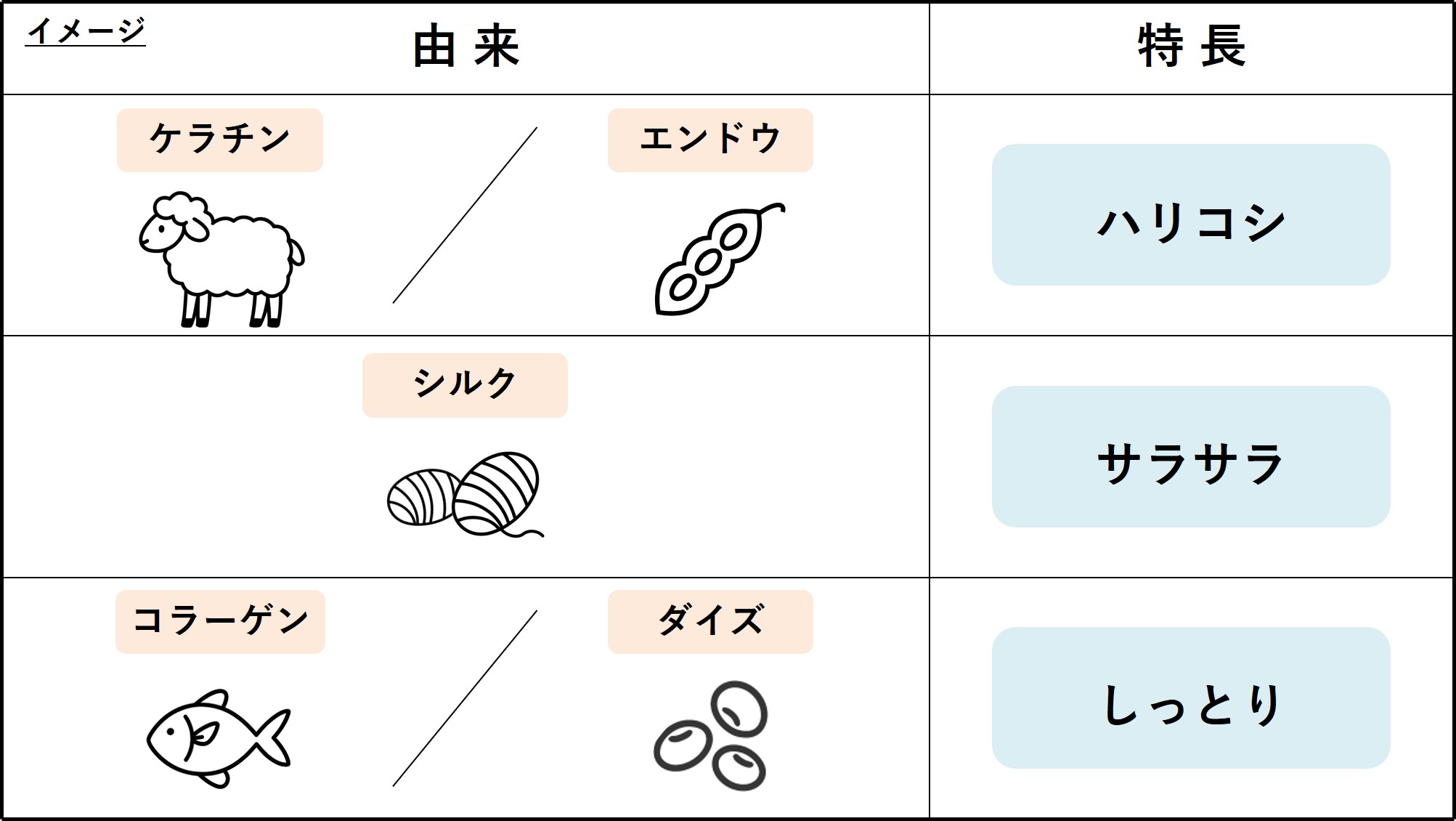 タンパク質らしさとは、例えばケラチンはハリコシ感、コラーゲンはしっとり感、シルクはサラサラ感というものです。