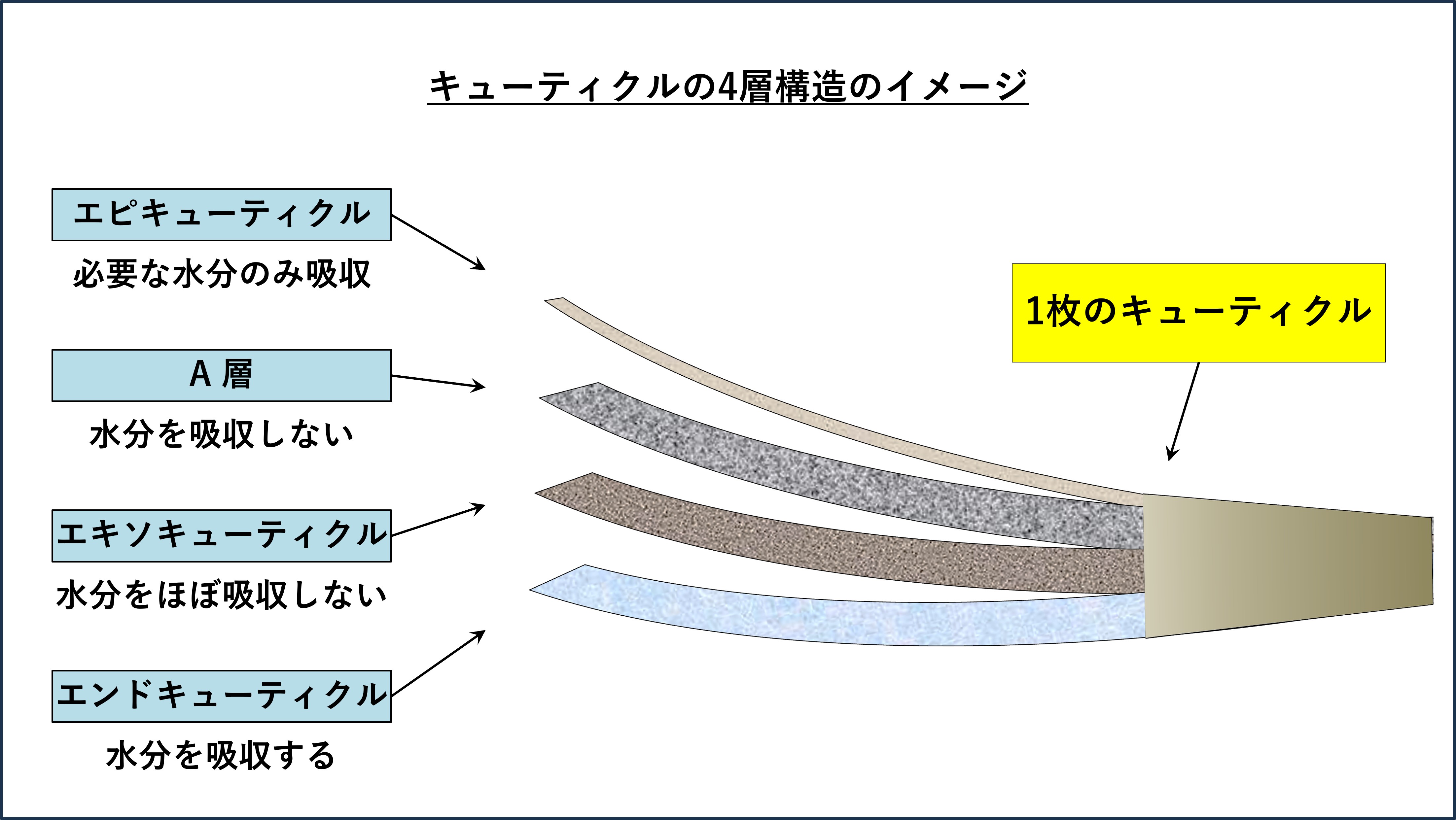 それら4つの層を、まず簡単にお伝えすると、上から「エピキューティクル」「A 層」「エキソキューティクル」「エンドキューティクル」となっており、おおまかに上から下にかけて、徐々に、水を吸いやすくなる・ダメージしやすくなる、といった特徴があります。