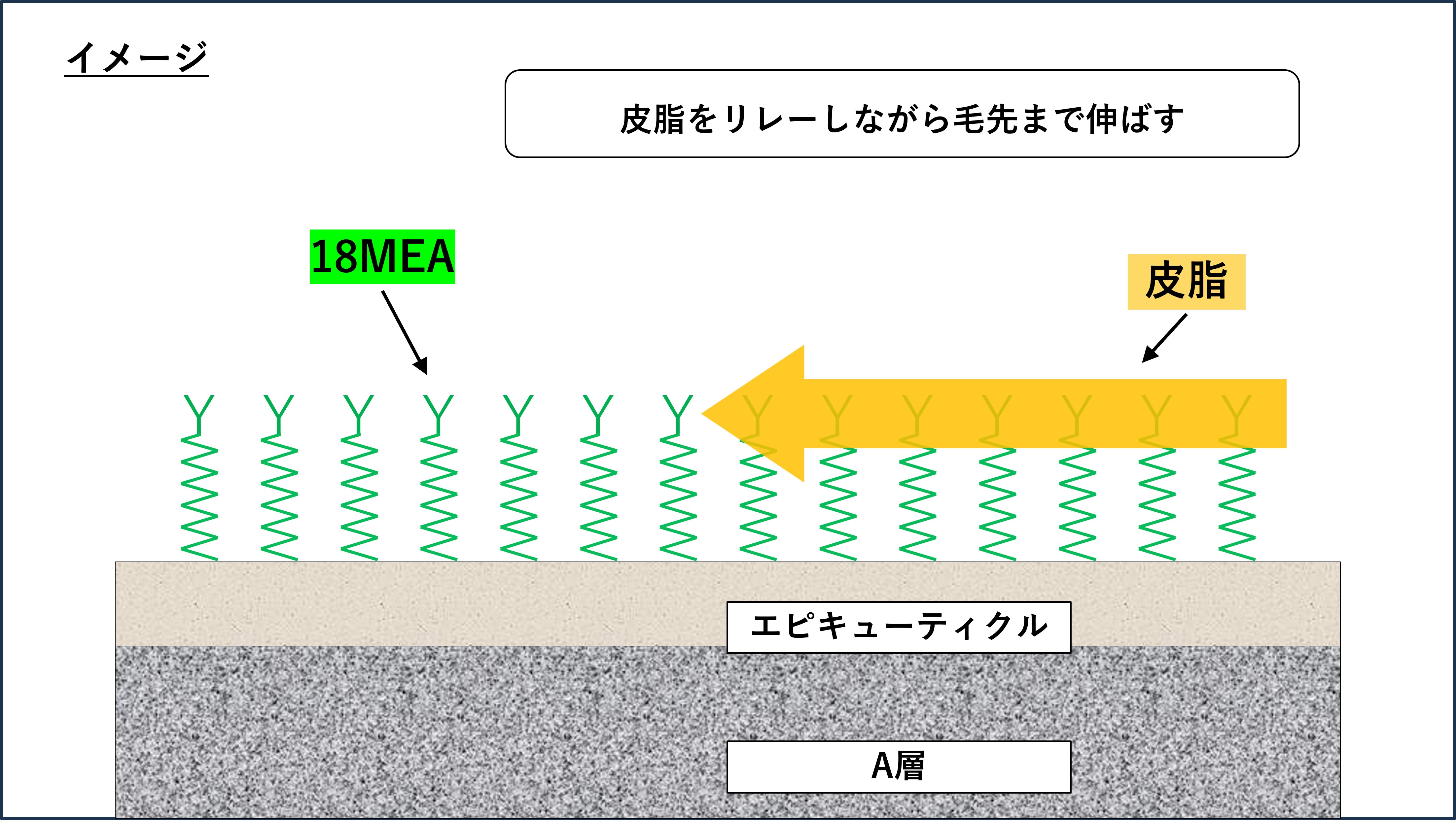 先ほどご紹介したとおり、キューティクルの最上層にはエピキューティクルという組織がありますが、実はそのエピキューティクルの上には、18MEA(18エムイーエー)という脂肪酸が存在しています。