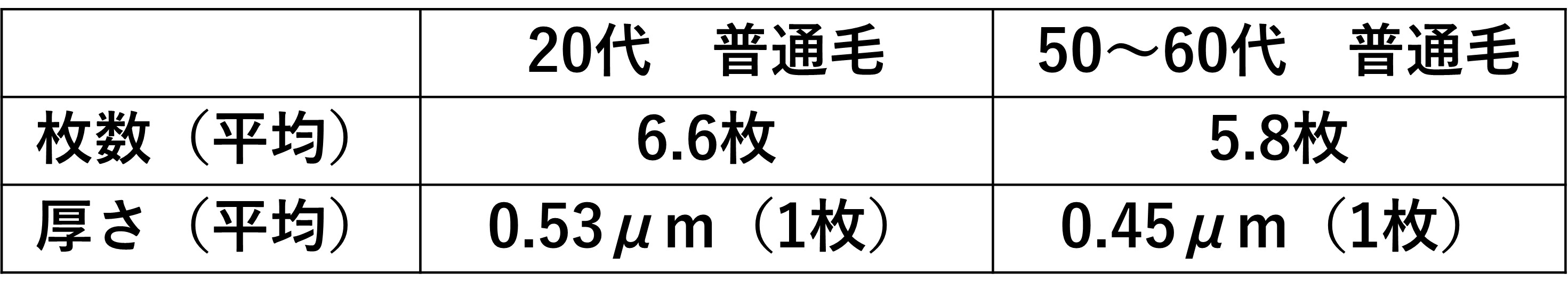 また同様に、キューティクル1枚の厚さも、加齢により薄くなることが分かっています。