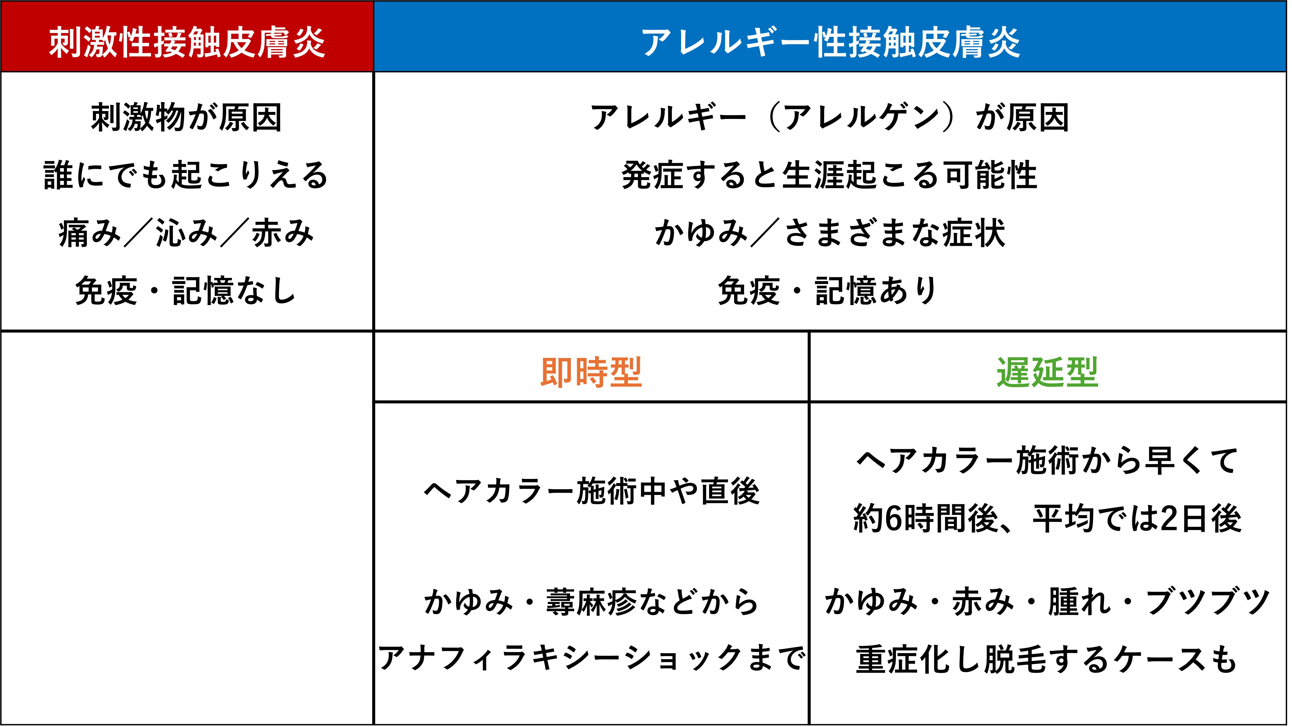 まず基本として、ヘアカラーで起こる皮膚炎(かぶれ)には「刺激性接触皮膚炎」と「アレルギー性接触皮膚炎」があります。