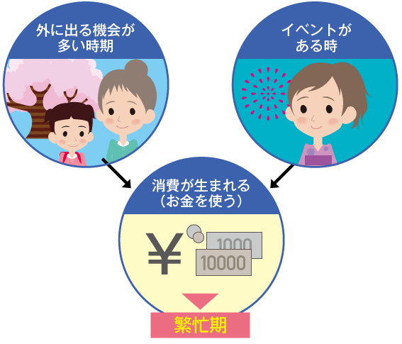 一般的に春先や夏休みなど外に出る機会が多い時期やバレンタインデーなど物を買う理由がある時に消費が生まれます。