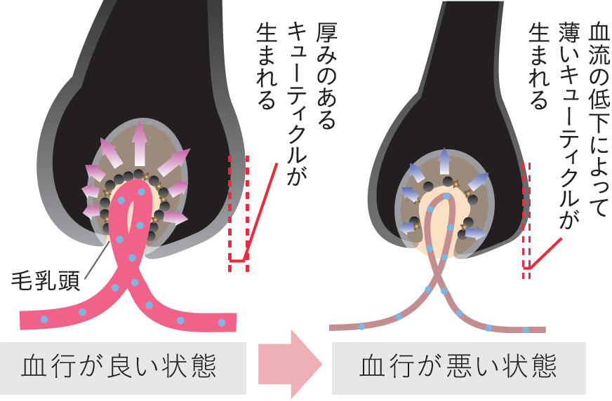 酸素や栄養が不足することで、枚数が減り薄くなったキューティクルが生まれてしまいます。
