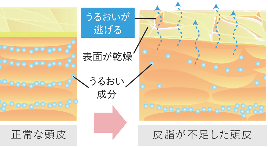 加齢により頭皮のうるおいを守る皮脂が減少し、うるおいが維持できず、頭皮は乾燥しやすくなります。