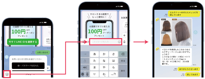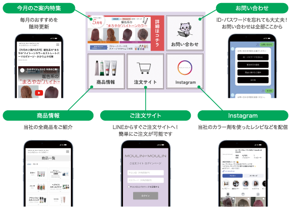 ムーランエムーランのLINE@を友だち登録いただくと、トーク画面から『注文サイト』や『サロンさま専用サイト』に楽々アクセスできるようになりました。