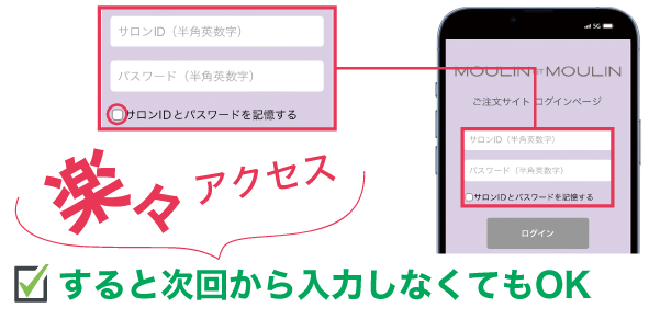 注文サイトログイン時のID/PASSの入力も、1度記憶させてしまえば次回からは入力不要!初回に「サロンIDとパスワードを記憶する」にチェックするだけ♪次回からはログインボタンを押すだけでOK!