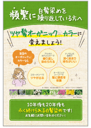 深く染まり毎月染めてもツヤ髪が続く、ツヤ髪オーガニックカラーとしてご案内できるPOPです。