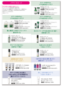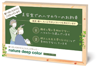 ネイチャーディープカラーで染めることで、髪をいたわる点やオーガニック成分が配合されていることなどをまとめたPOP集(13枚入り)です。お客さまと髪の話をする自然なきっかけをつくります。