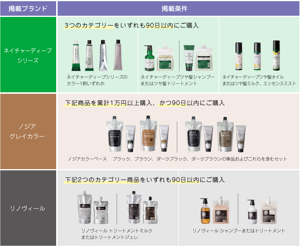 検索対象のブランドは『ネイチャーディープシリーズ』・『ノジア(グレイカラー)』・『リノヴィール』です。