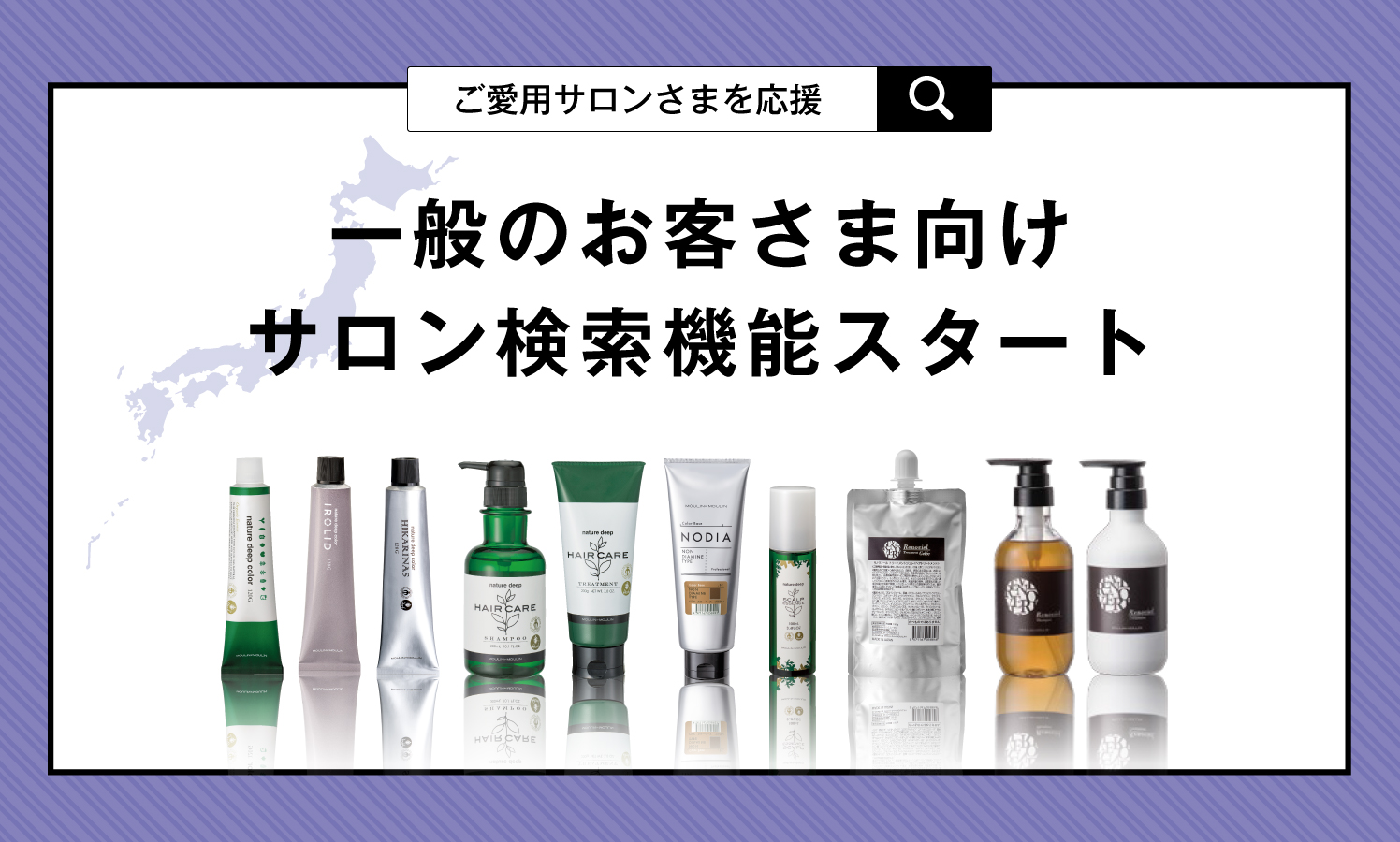 SNS等で商品を知っていただき、ムーランエムーランの一般のお客さま用WEBサイト(ムーランエムーランや商品名で検索すると表示されます)に来ていただいたお客さまが、取り扱いサロンを検索する際にご利用いただけるサービスです。
