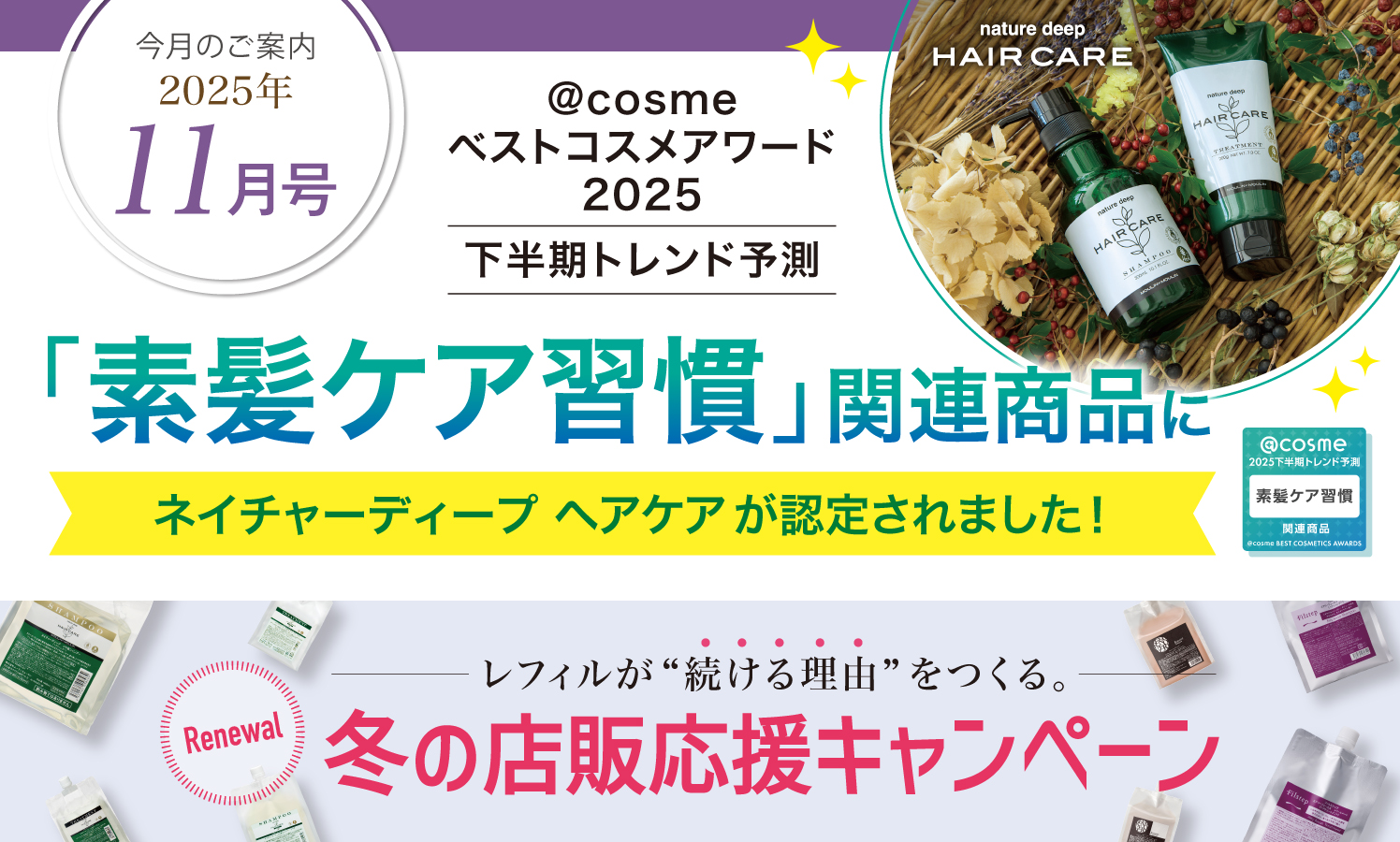 【今月のご案内11月号】@cosmeトレンド予測「素髪ケア習慣」関連商品に認定&冬の店販応援キャンペーン