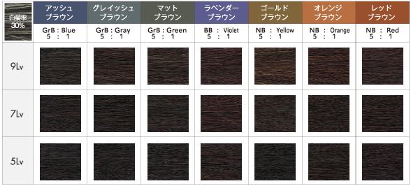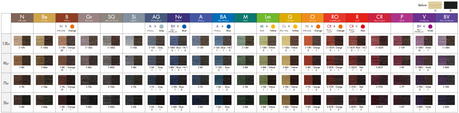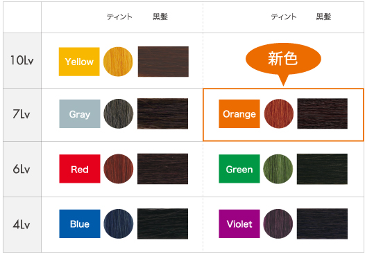 高発色のカラー剤として単品でもご使用いただけます。アルカリ設定は、ファッションカラーの7レベル相当ですが、色味の特長で仕上がりの明るさイメージが異なりますので、表をご確認ください。