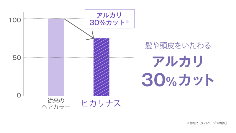 ブリーチ力に頼らずに透明感のある色味を実現できるため、アルカリ30%カット※を実現。※当社比(リフトベージュは除く)