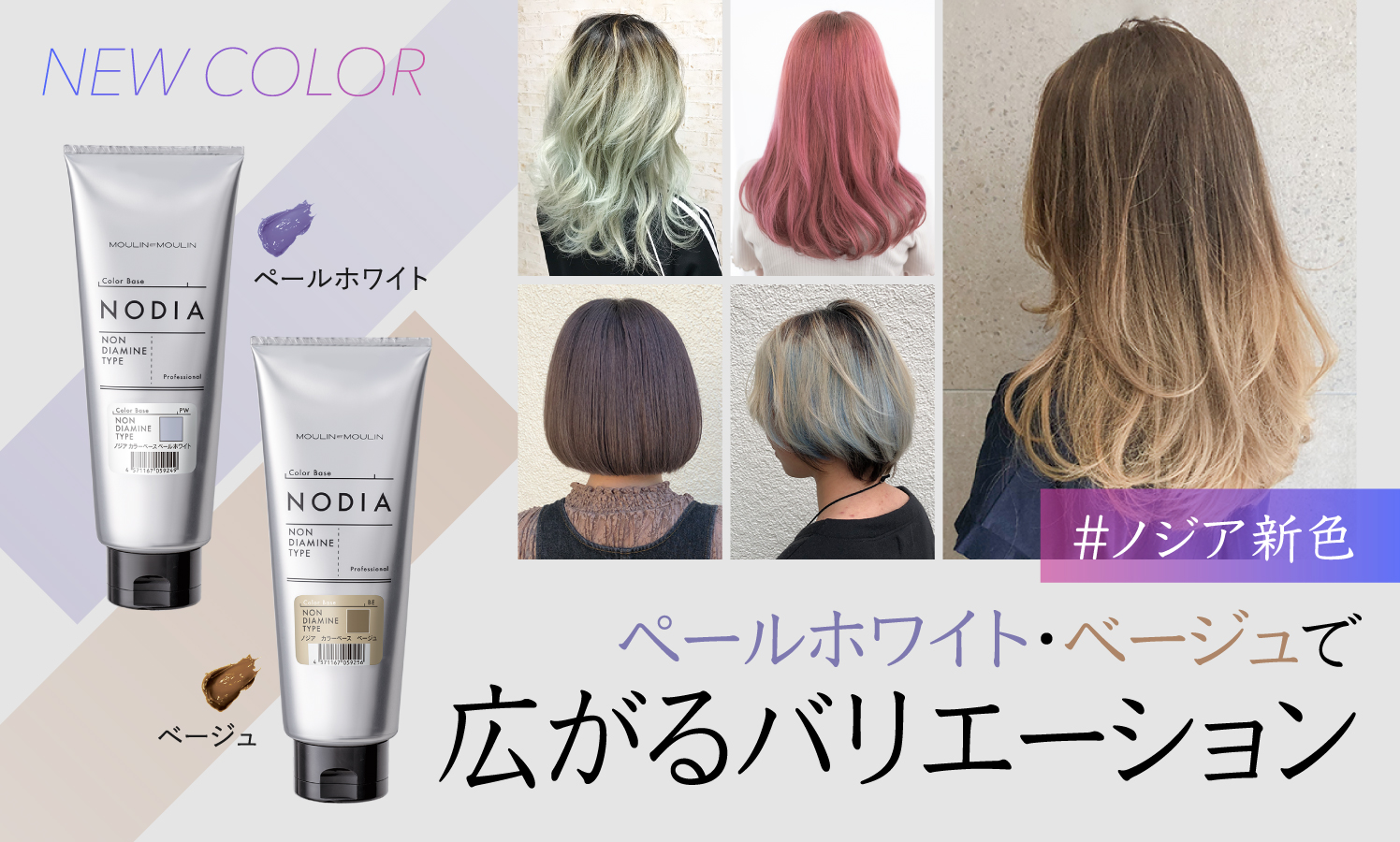 夏に人気が高まるビビッドなブリーチオンカラー! イロリドは濃厚発色で色味をしっかり表現 アルカリカラーでは出せない高彩度な色味なら塩基性カラーNODIA お客さまのご希望を叶えるカラー事例をご紹介。 ブリーチオンカラーはどうしても色落ちが早くなりますが、(色味にもよりますが、1週間程度で気になり始めます) 仕上がりのポイントとなるブリーチ施術や、ご自宅のケアにオススメなカラーシャンプーの色落ち・黄味対策についてもぜひチェックしてください! INDEX イロリドを使ったハイトーンカラー事例 ハイトーン施術のポイント Before18Lvからの透明感ハイトーンピンクオレンジ Before16Lvからのカジュアルオレンジ Before16Lvからのブロンド系ベージュカラー Before16Lvからのオレンジベージュ Before16Lvからのミルキーベージュ Before17Lvからのラベンダーグレージュ Before14~16Lvからのグラデーションピンク Before16Lvからのビビットなピンク 【ビビッドな色味&ブリーチ後のダメージを抑える】塩基性カラーNODIA事例 塩基性カラーのハイトーン施術のポイント Before18Lvからのビビッドなイエロー Before18Lvからのイエローグリーン Before17~18Lvからのビビッドなパープル Before16Lvからのクリアなオレンジ Before15Lvからのライムイエロー Before17Lvからのさわやかなシアンブルー ハイトーンカラー関連コンテンツ 失敗しないブリーチ施術のための基本マニュアル 【ハイトーンカラーの色落ち・黄味対策に】カラーシャンプーの活用・メニュー化方法 【カラーの色流れを抑える】ノジア カラーキープシャンプー イロリドを使ったハイトーンカラー事例 施術のポイント ベースの明るさ ビビッドな色味を表現するにはベースをブリーチで整えてからオンカラーします。 ナチュラルな暖色系であれば14~16Lvで表現できますが、ペール系やホワイト系になるほどベースを18Lv以上に整えてからでないと色味がキレイに表現しにくくなります。 ダメージケアをしっかり ダメージが大きいと色抜けや色ムラの原因になります。ブリーチ時、カラー時などの前後処理は必ず行ってください。髪の状態によってブリーチにどこまで耐えられるかは判断が必要です。 色ムラが出ないように 基本は素早く塗ってしっかり放置するのがポイントです。毛先などに前回のカラーの残留色素がある場合や、ハイダメージで吸い込みやすい場合は薬剤の塗り分けなども必要になってきます。 ▲上に戻る Before18Lvからの透明感ハイトーンピンクオレンジ Before 18Lv ※ブリーチを繰り返している髪。今回はリタッチなし Color(イロリド) I-9CR : ティントライン オレンジ:クリア=4: 1 :5(2剤2%) ▲上に戻る Before16Lvからのカジュアルオレンジ Before ブリーチ部分 16~17Lv 新生部5~6㎝ ※前回のブリーチ履歴を活かし、追いブリーチ無し Color(イロリド) ティントライン オレンジ:ティントライン イエロー=3: 1 (2剤2%) ※オンカラーは全体に実施 ▲上に戻る Before16Lvからのブロンド系ベージュカラー Before 16Lv ※中間はブリーチ履歴1回、毛先はブリーチ履歴2回。新生部から毛先まで全体に1回ブリーチ Color(イロリド) I-9Be:I-9N:クリア=4:1:2.5(2剤2%) 赤味を抑え、マスタードっぽいブロンドベージュの仕上がりに。ベージュにナチュラルを加えることで、ベースを整え色むら無く、つながりをよくしています。 ▲上に戻る Before16Lvからのオレンジベージュ Before 16Lv Color(イロリド) I-13Gr:ティントライン オレンジ=3:1 (2剤2%) ▲上に戻る Before16Lvからのミルキーベージュ Before 13Lv ※2か月前にカラー PointColor(イロリド) STEP1 16Lvまでポイントブリーチ 耳まわりにパネルブリーチ(ブリーチパウダー:2剤=1:3) 放置時間60分(30分放置後、新しく作ったブリーチ剤を再塗布し、更に30分放置) STEP2 オンカラー I-9N:I-9BV:クリア=5:1:6(2剤2%) ※全体をI-9Gr:I-7Bv=5:1(新生部は2剤6%、既染部は2剤2%)でカラーしてからポイントカラー。 ▲上に戻る Before17Lvからのラベンダーグレージュ Before カラー履歴無し PointColor(イロリド) STEP1 17Lvまでポイントブリーチ 前髪の内側~顔まわり、耳上までをブリーチ(ブリーチパウダー:2剤=1:3) 放置時間60分(30分放置後、新しく作ったブリーチ剤を再塗布し、更に30分放置) STEP2 ポイントのみオンカラー I-9BV:I-9Gr:クリア=2:1:1(2剤2%) ▲上に戻る Before14~16Lvからのグラデーションピンク Before 12Lv ※2か月前にカラー Color(イロリド) STEP1 14~16Lvにグラデーションブリーチ (1)ハチ下からハイライト(1パネルあたりに毛束2㎝幅で2~3本入れ、バック3段5枚 サイド2枚) (2)肩下から14LTを塗布 (毛先15cm) 塗布した境目に水スプレーをしてぼかすようになじませる (3)毛先7cmにブリーチ剤(ブリーチパウダー:2剤=1:3)を塗布し20分放置 STEP2 オンカラー 既染部 I-9P:I-7P=1:1 (2剤2%) 20分放置 新生部 I-9P:I-7P=1:1 (2剤6%) ▲上に戻る Before16Lvからのビビットなピンク Before 新生部なし 全体16Lv(ブリーチ履歴有) Color(イロリド) 全体:I-7P(2剤2%) ※色味を濃く表現するため7Lvを使用 ▲上に戻る 【ビビッドな色味&ブリーチ後のダメージを抑える】塩基性カラーNODIA事例 塩基性