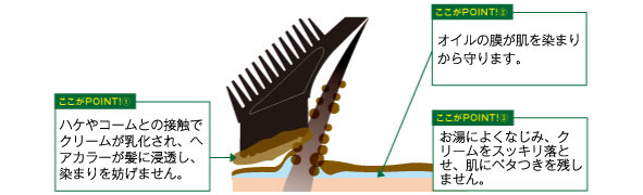 髪にクリームがついても、ヘアカラーを上から塗布して染めることができ、ムラになりません。