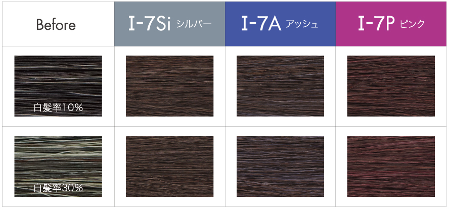 7レベル以下のN、Co、Grは7Lvで白髪になじみます。一般的なグレイカラーよりブラウン味が少なく、透明感のある仕上がりです。
