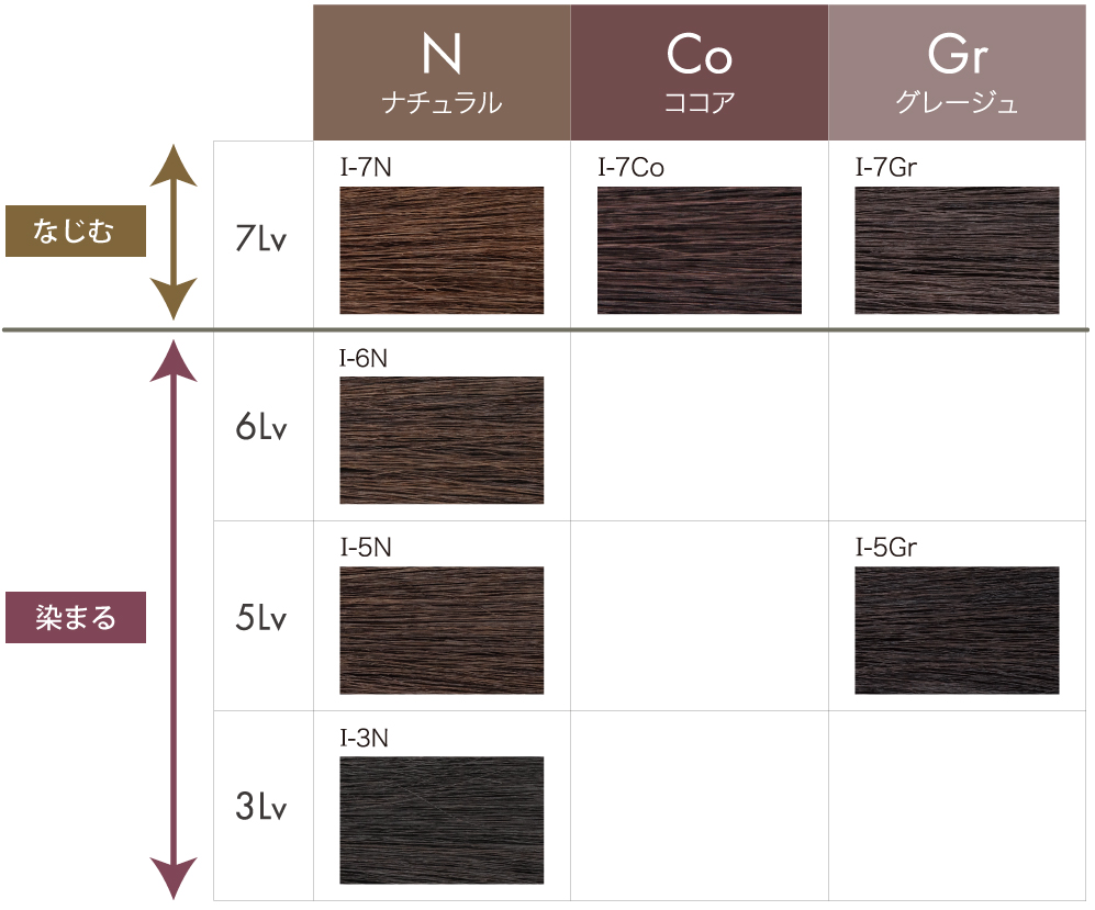 - 7レベル以下のN・Co・Grは白髪染めにも対応可能