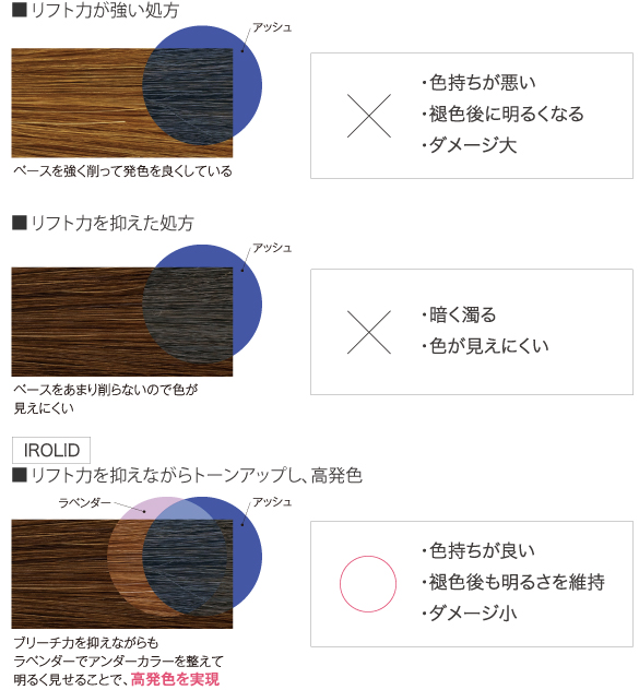 リフト力は抑え、色の濃さで発色させることで、明るくなりすぎずに色味が残ります。