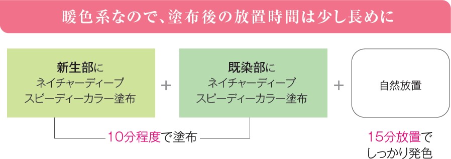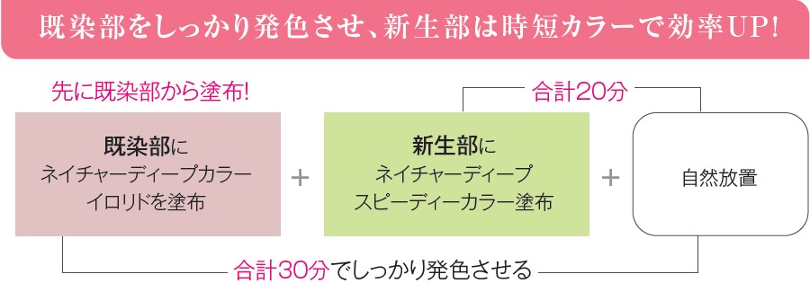 ※中間→毛先の順にイロリドで染めて、その後すぐに根元にネイチャーディープスピーディーカラーを塗布。新生部塗布~放置で20分で完了。