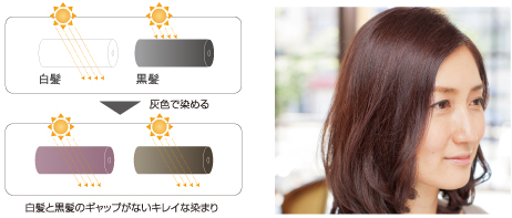多種類の淡い色の染料をバランスよく配合した処方により、黒ではなく灰色で白髪の透過率を下げ、白髪は目立たなくなり、黒髪は沈み過ぎず、白髪と黒髪のギャップのないキレイな染まりを実現します(7・9レベル)。また、白髪と黒髪が半透明の状態になるため、透明感のある色味を楽しめます。