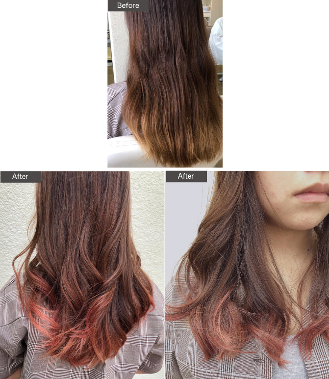 以前作ったグラデーションが残る毛先を活かした裾カラー。透け感のあるピンクに。