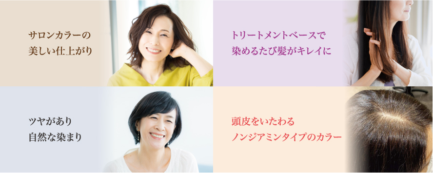 - 酸化染料を一切含まない、ノンジアミン・ノン酸化染料カラー