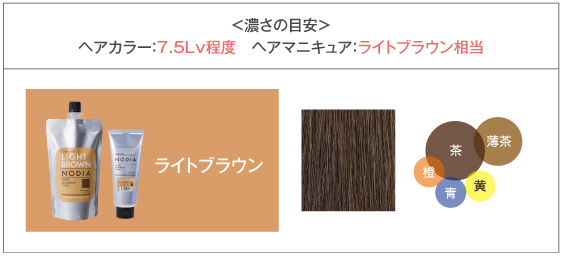 これまでブラウンよりも色味を明るくしたい場合はベージュをMixしていただきましたが、ライトブラウンはブラウン:ベージュ=1:1~3:2 程度の明るさで、赤味と黄味のバランスが良く、白髪へのなじみがよい色味です。