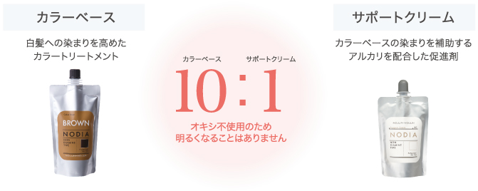 NODIAは染まりを高めるために、必ずサポートクリームを混ぜてご使用ください。