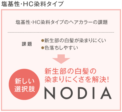 NODIAは塩基性・HC染料を使用し、ジアミンなどの酸化染料を一切含まないノンジアミンカラーです。