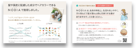 アレルギーリスクを避けるには、カラーカップ、カラーコーム、イヤーキャップ、マドラーなどのヘアカラーに使用する道具は「ノジア」専用にし、ジアミンを含む他のヘアカラーとは分けてご使用ください。また、お客さまの肌に触れるもの(クロス類、シャンプー台の枕)にも配慮をすると安全です。