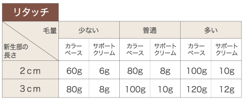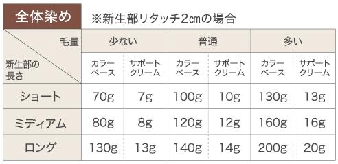 - 通常のアルカリカラーの総量(1剤+2剤)の1.1倍が目安です。