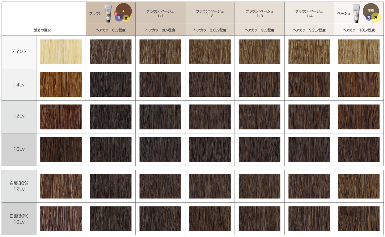 ライトブラウンとベージュのMixは既染部の使用にオススメします。白髪ぼかしとしてはご利用いただけますが、色持ちはよくありません。