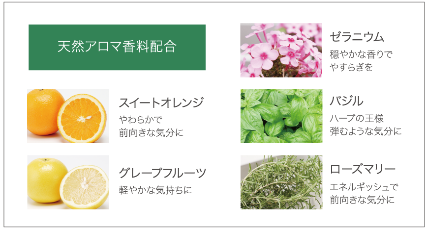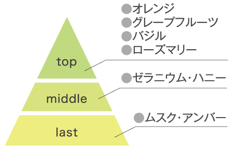 やわらかくハニーなフローラルノートにフルーティな柑橘系の香りとナチュラルなハーブの香りをブレンド。前向きで明るい気分にさせてくれる香り。