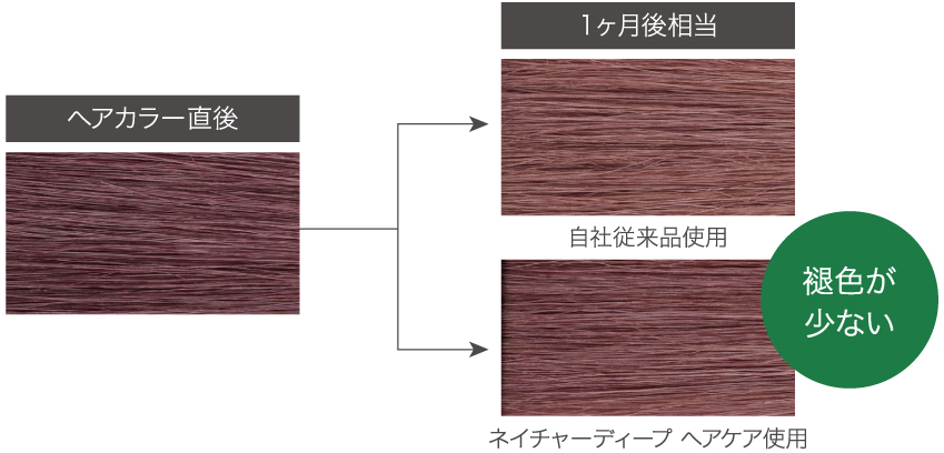 ※白100%の毛束にカラーを処理し、自社従来品とネイチャーディープツヤ髪シャンプーでそれぞれ洗って検証