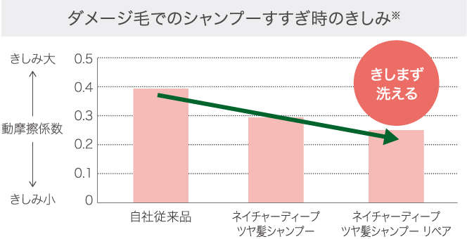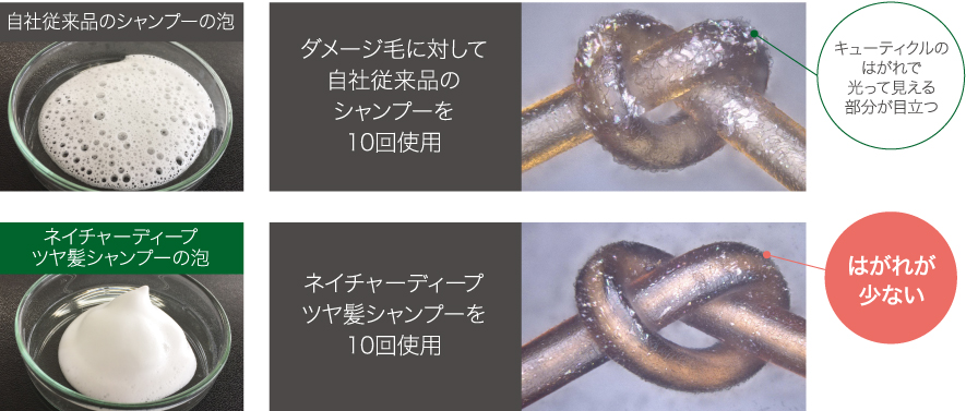 ダメージ毛でも洗髪時のきしみを抑えることで、キューティクルを傷つけることなく洗い上げます。