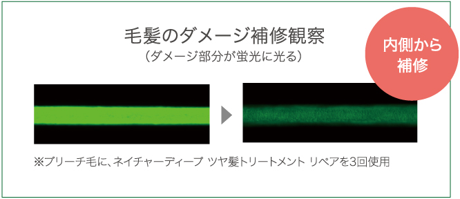 CMC成分(Wセラミド)と、ダメージした毛先に集中的にうるおいを届けるアミノセンサーで傷んだキューティクルを補修し、カラーの色ツヤをキープする美しい髪へ。
