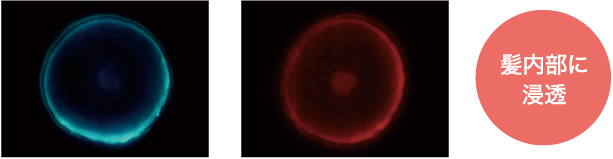 ※左は青色に着色した活性ケラチン、右は赤色に着色した浸透エルカラクトンで浸透の様子を確認