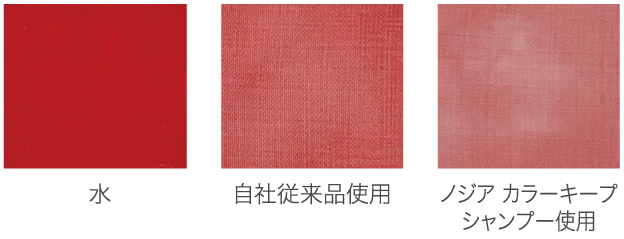 ※ハイブリーチ毛束(18Lv)をノジア カラーベース レッドで染めた後、自社従来品とノジア カラーキープシャンプーでそれぞれ洗髪