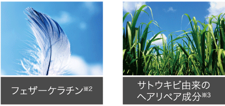 ※2 ヒドロキシプロピルトリモニウム加水分解ケラチン(羽毛)(毛髪補修成分)、※3 ジグルコシル没食子酸(毛髪補修成分)