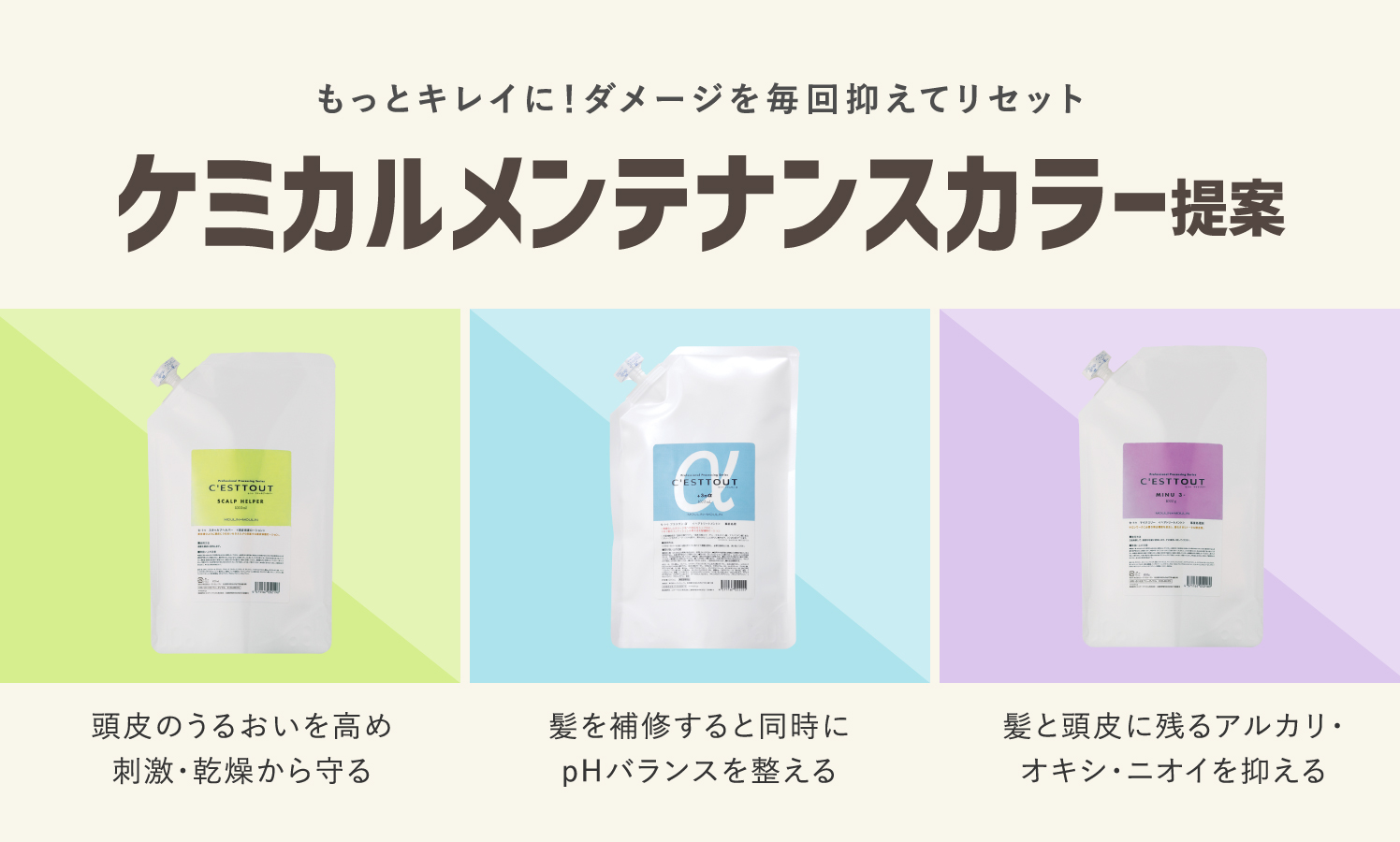 ムーランエムーランでは2023年9月にマテリケアを発売!最大4アイテムで事前処理~トリートメント仕上げまで完結し、ダメージ補修力・防止力を向上させた処理剤シリーズです。既存の処理剤と併せて、使用目的や違いをご紹介します! INDEX 処理剤でダメージ毛へのヘアカラー・パーマの仕上がりが高まる 処理剤の主な種類と役割 ムーランエムーランの処理剤(ブランド別) 【マテリケア】最大4アイテムで事前・事後処理が完結 【KPX】内部補修に特化したプレックス系処理剤 【セ・トゥ】コストを抑えられる多機能処理剤 ムーランエムーランの主な処理剤(アイテム別) 【事前処理】CMC補給 【事前処理】PPT補給 【事後処理】残留物除去 【事後処理】キューティクルコート 処理剤でダメージ毛へのヘアカラー・パーマの仕上がりが高まる ダメージ毛に、そのままヘアカラー・パーマ・ストレート施術を行うと、カラーの色味が思うように出なかったり、パーマがうまくかからなかったり、ダメージがさらに進行するなどの不安要素が出てきます。 カラー剤やパーマ剤の薬剤そのもののダメージは減少してきているのですが、ダメージを減らすことはできても、髪を補修することはできません。 メニュートリートメントは施術後に行うため、施術前の髪のコンディションを整えることはできません。 処理剤は『施術前に髪に不足した成分を補う』『施術後のダメージ要因を取り除く』ことができるため、 カラーやパーマの仕上がりを高め、ダメージの進行を抑えることができます。 ダメージ毛にヘアカラー・パーマを行うときの不安要素 カラーの定着・発色が悪い パーマのかかりが弱い 仕上がりがムラになる カラーやパーマの持ちが悪い ダメージが進行する 処理剤を使用してから施術を行うと カラーの定着・発色が良くなる パーマがしっかりかかる ムラなくキレイに仕上がる カラーやパーマの持ちが良くなる 施術によるダメージを抑える ▲上に戻る 処理剤の主な種類と役割 処理剤は大きく事前処理と事後処理剤に分かれます。 事前処理では髪のダメージ部分に不足した成分(たんぱく質や脂質)を補い、 事後処理では薬剤を使った施術によるダメージ要因を取り除き、髪の状態を整えます。 事前処理の目的 ダメージで不足したうるおい成分やたんぱく質を与える ヘアカラーやパーマなどの薬剤が均一に浸透しやすくする 薬剤の過剰反応を抑えてダメージリスクを減らす 事後処理の目的 施術後のすすぎやシャンプーで取り除けない、ダメージの原因となる成分(オキシ・金属イオンなど)を取り除く 薬剤でアルカリに傾いた髪のpHを調整して開いたキューティクルを閉じる 髪に栄養分を与えながら表面をコートして整える ▲上に戻る ムーランエムーランの処理剤(ブランド別) 【マテリケア】最大4アイテムで事前・事後処理が完結 事前処理のCMC補給・PPT補給、事後処理の残留物除去・キューティクルコートの4つの役割のアイテムが揃ったシリーズです。 こんな方に ヘアカラーの発色・色持ち、パーマのかかりが心配なダメージヘアに 薬剤によるダメージを防ぐことをメインに仕上がりも少し高めたい方に 通常のメニュートリートメントよりも時短で仕上げたい方 参考メニュー価格 1,000~2,000円 マテリケアについて詳しくはコチラ [nlink url="https://m-moulin.jp/business/lineup/menu-treatment/materi/"] ▲上に戻る 【KPX】内部補修に特化したプレックス系処理剤 髪の骨組みを強化するプレックス系の処理剤。 これまでのプレックス系の処理剤のデメリットである仕上がりの硬さやきしみ感を解消しているため、ハリ・コシを高めながらもしなやかに仕上がります。 活性ケラチンなどの内部補修をメインとしており、ブリーチ施術には特にオススメです。 こんな方に ブリーチなど内部のダメージが気になる施術に ハリ・コシの無い髪でケミカル施術を行う方に 参考メニュー価格 500~1,000円(ホームケア付で1,500~2,500円など) KPXについて詳しくはコチラ [nlink url="https://m-moulin.jp/business/lineup/menu-treatment/kpx/"] ▲上に戻る 【セ・トゥ】コストを抑えられる多機能処理剤 頭皮保護・毛髪補修・抑制機能の3つで事前処理・事後処理で抑えておきたい機能を集約。 低コストで手軽にお使いいただけるシリーズです。 詳しくはコチラ [nlink url="https://m-moulin.jp/business/lineup/menu-treatment/cesttout/"] ▲上に戻る ムーランエムーランの処理剤(アイテム別) 【事前処理】CMC補給 マテリケア『モイスト』、セ・トゥ『プラスサンα』が対象です。 CMC補給の目的 髪にうるおいを与える 薬剤の浸透を均一にする 仕上がりのムラを防ぐ CMC は 元々の健康な髪の毛にも含まれている成分で、主にキューティクルやコルテックスを接着して髪の毛の成分を繋ぎ、保湿剤としての役割があります。CMCが不足すると、キューティクルがめくれ上がって内部成分が流出しやすくなったり、薬剤の通り道が確保されなかったり、髪がパサついたりします。 特長の違い ※マテリケア『モイスト』はナノ