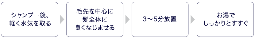 ※塗布した後コーミングや揉みこみを行いますが強く握りしめると髪にダメージを与えることになりますのでやさしく揉みこんでください。
